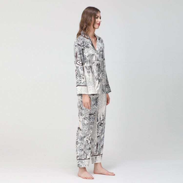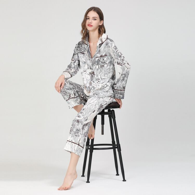 アンティークなデザインが光る、モノトーンの落ち着いたパジャマは、寝る前にゆったり心を落ち着けたい女性に最適です。